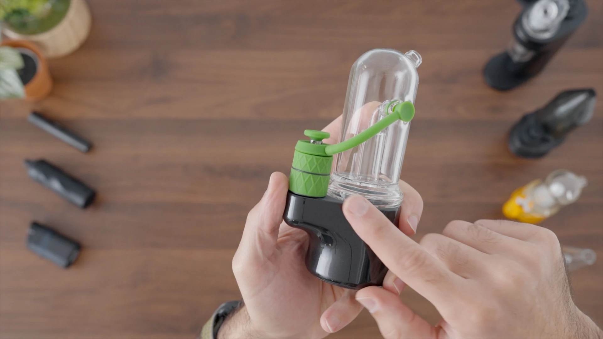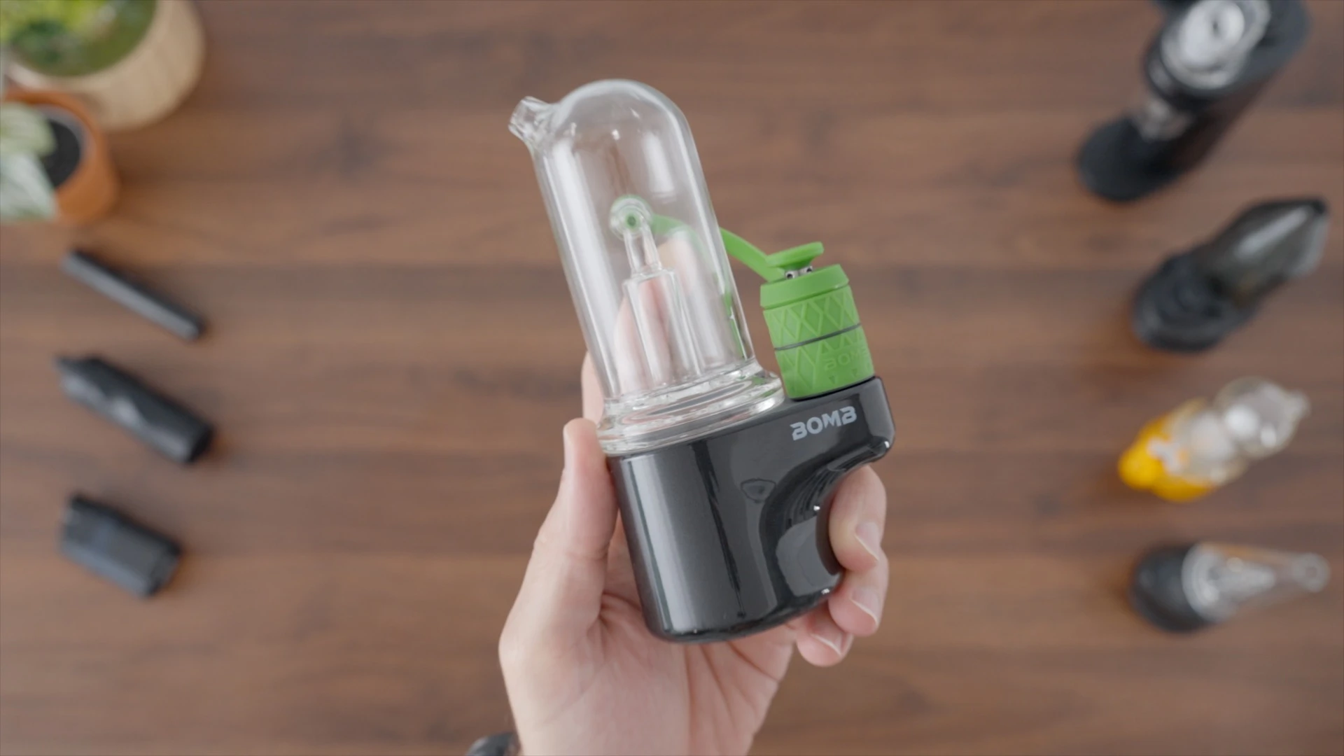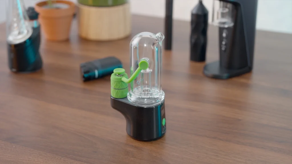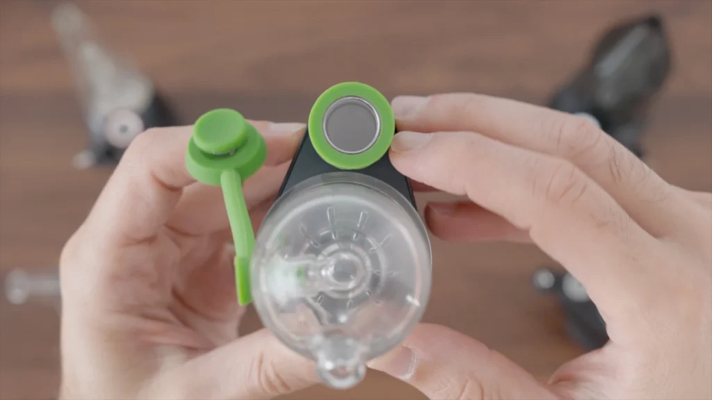With the Aerix, Bomb solved this issue by removing the slits from the chamber, and removing the internal airpath, and instead- the carb cap has a little hole- and that’s where the vapor goes. It passes in the green tube and into the bubbler. It’s an interesting design that will definitely make cleaning easier.