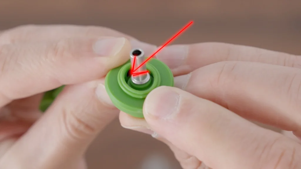 But this design has a major drawback. Over repeated use, hot oil (aka reclaim) makes its way into the air holes, and then into the airpath, and from there- the can seep in under the silicone seal- this is a very well known issue with Puffco devices, well documented on Reddit threads, and is notoriously difficult to clean. FocusV solved it by making the whole airpath removable- this piece connects the chamber and the bubbler, so oil can not seep under.