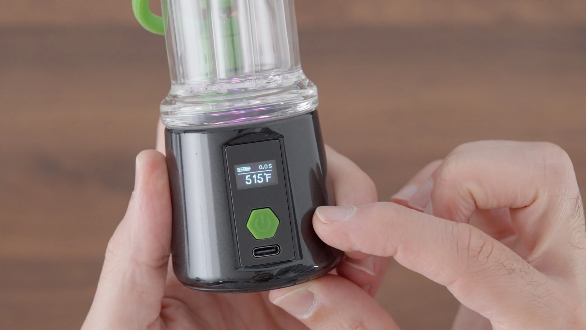 The interface has one activation button, and a screen that displays the set temp, battery levels, and session timer. Three clicks will enter “temperature setting” mode, and holding the button will increase the target temp until I let go.