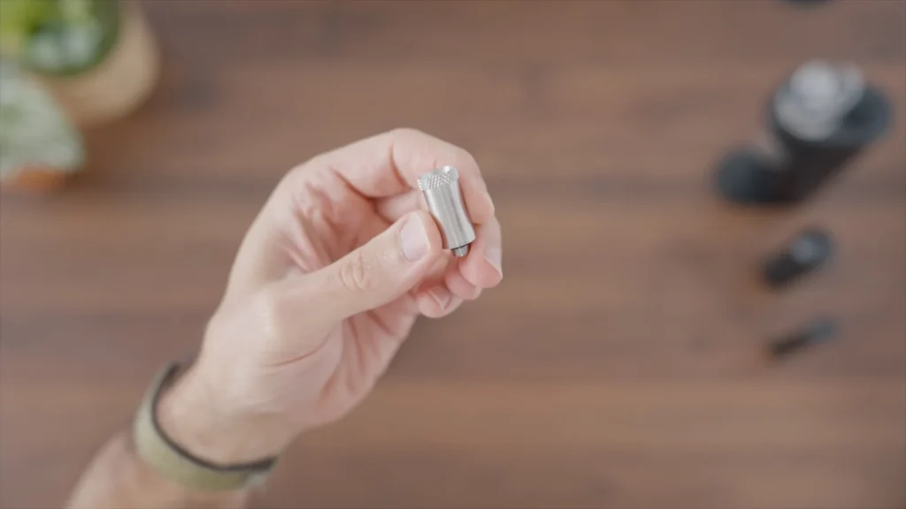 It has a knurled grip for easy unscrewing, and the chamber itself is fairly narrow and deep. It’s made from ceramic and features 360-degree heating with real-time temperature control — meaning it makes instant adjustments to maintain the precise target temperature. This is a really important feature that I’ve talked about a lot in my reviews, and it’s probably the single most crucial factor in any concentrate device.
