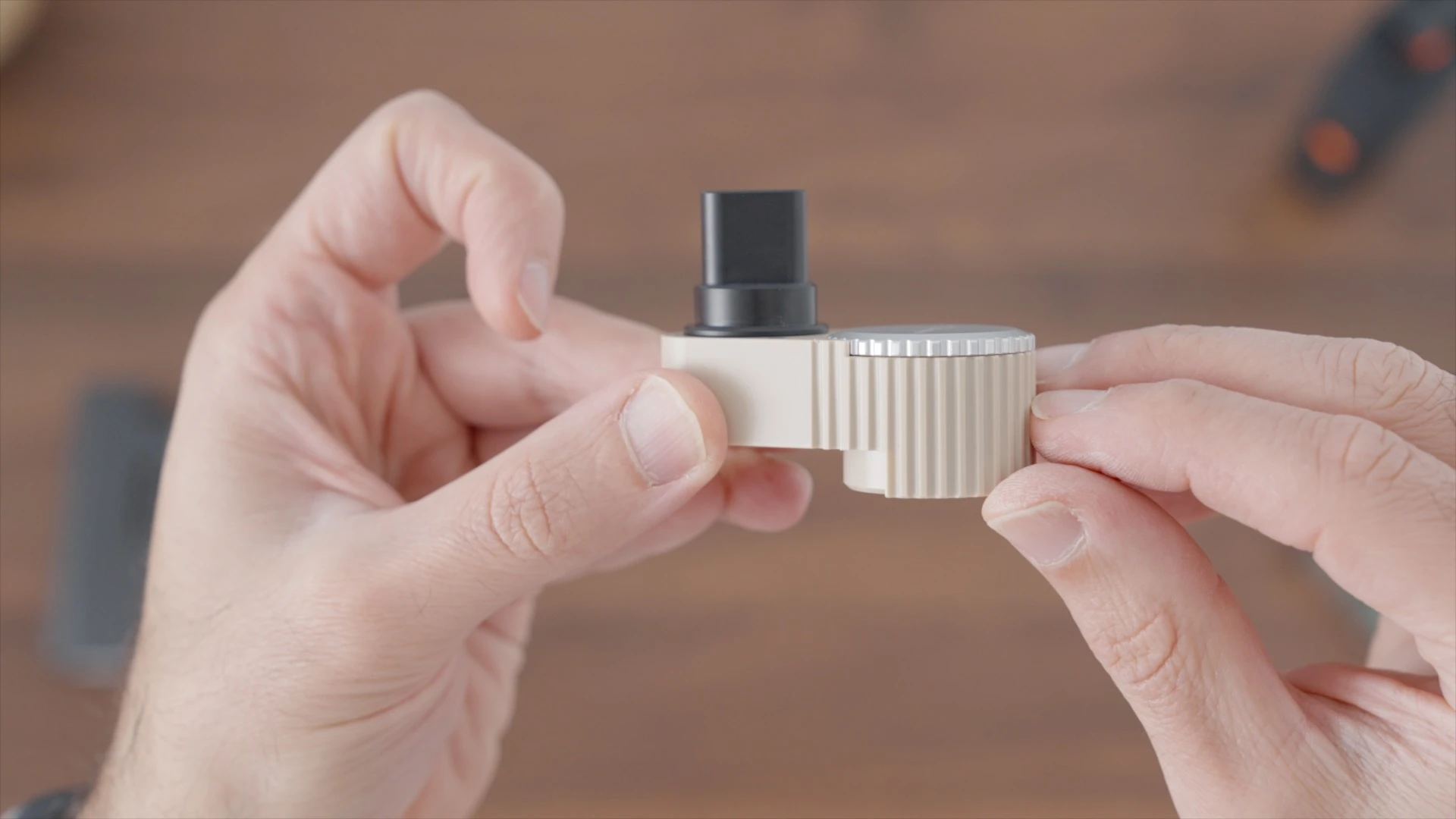 Now, your intuition may be that this large aluminum ring is the adjustable airflow dial, but it’s not. It just locks the two parts of the cooling unit together- they can be taken apart for cleaning. So basically, this large aluminum ring does what this little orange button does on the Venty.
