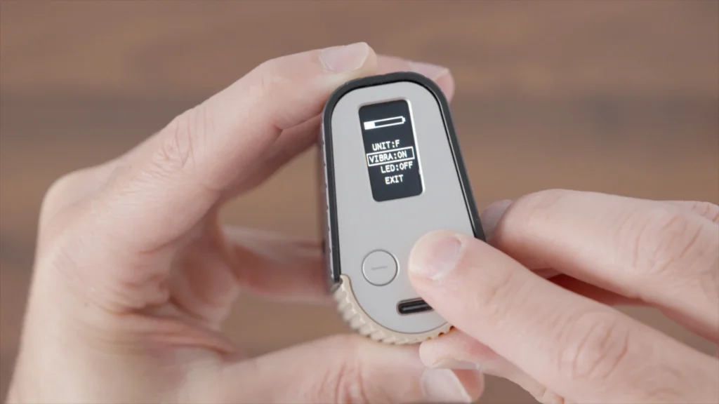As far as usage- when the unit is turned off, clicking the two buttons together will enter settings mode and allow you to change F°/C°, vibration settings, LED, etc.