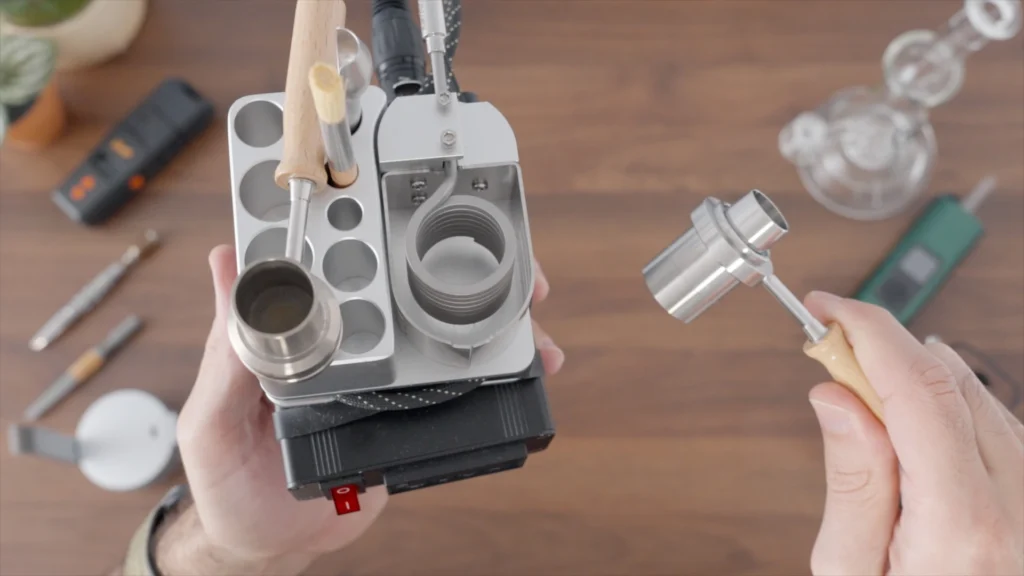 This large aluminum block is the docking station for the whole setup. It can be secured to the PID controller with two included rubber bands and it has a gap to fit the cord of the heater. , which is installed in its own compartment, and is plugged into the PID. There is also a cleaning brush, herb scoop, and some replacement screens.