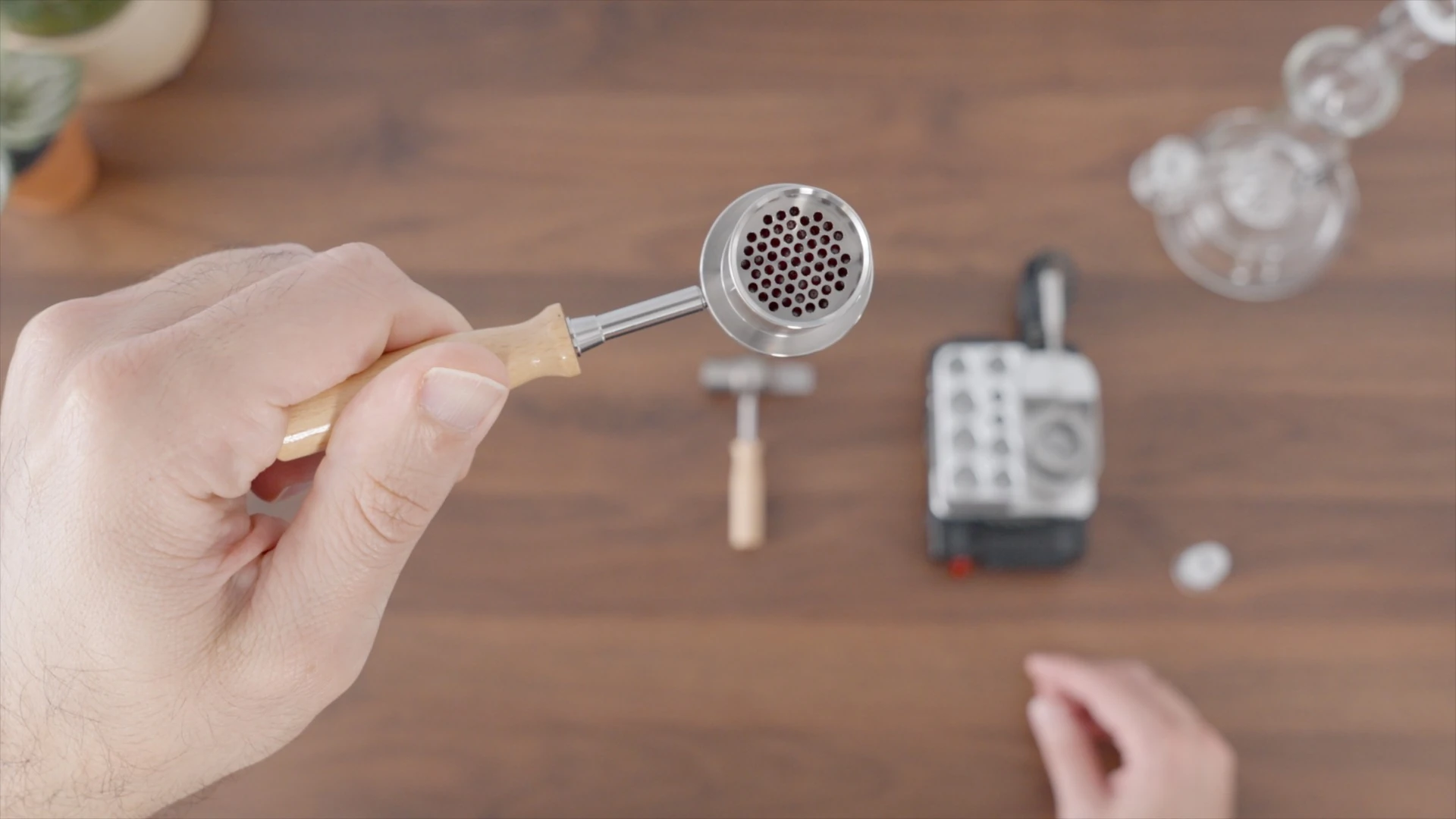 Meanwhile, the bowl goes on the bubbler. The herb goes in the bowl.