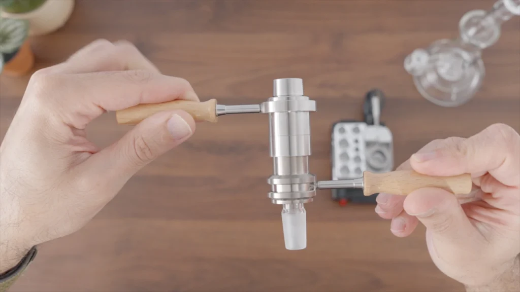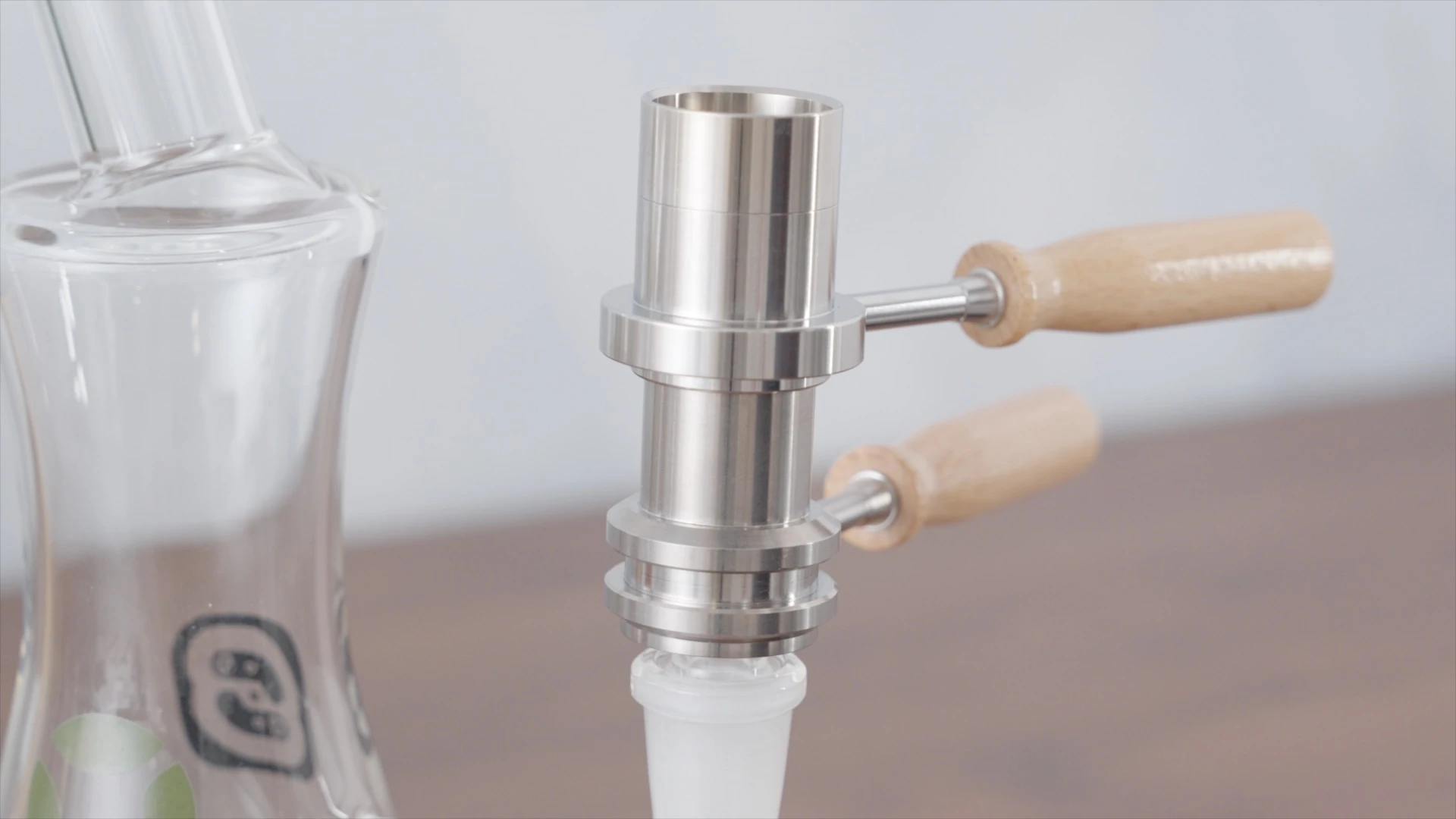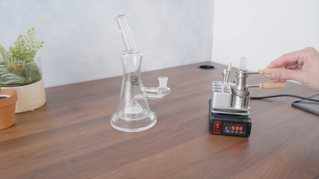 It’s worth mentioning a couple of things here. To get even more heat to soak into the system, I can place my bowl on the injector as it warms up, prior to filling it with herb. Heat transfers into the Titanium bowl and it is pre-heated before it’s placed on the bubbler, for an even denser hit.