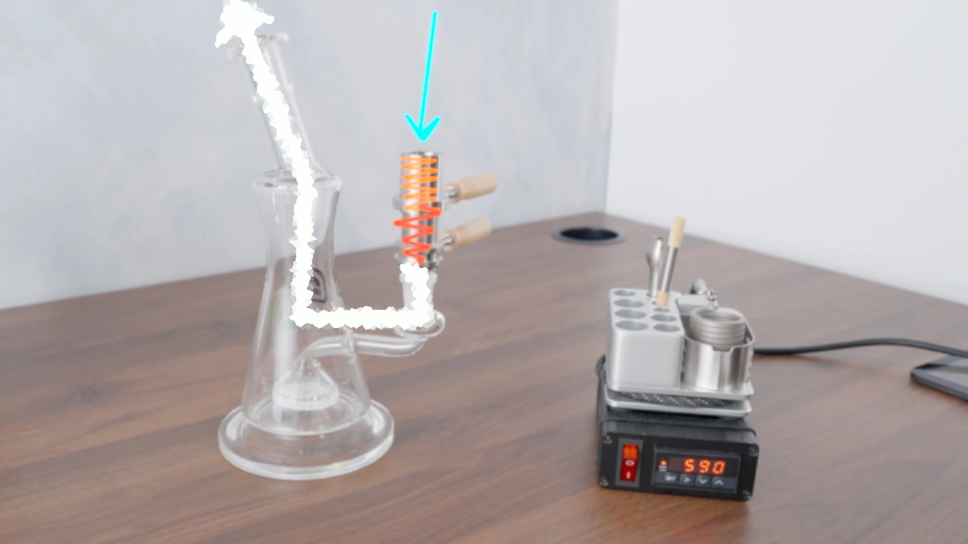I’ll place my injector in the heater, and turn the PID on. I’ll set my temp, 600°F is a good place to start, and the thing starts heating up. The spiral coil is heating up and transferring that heat to the chamber, and then to the balls- via conduction- meaning direct contact.